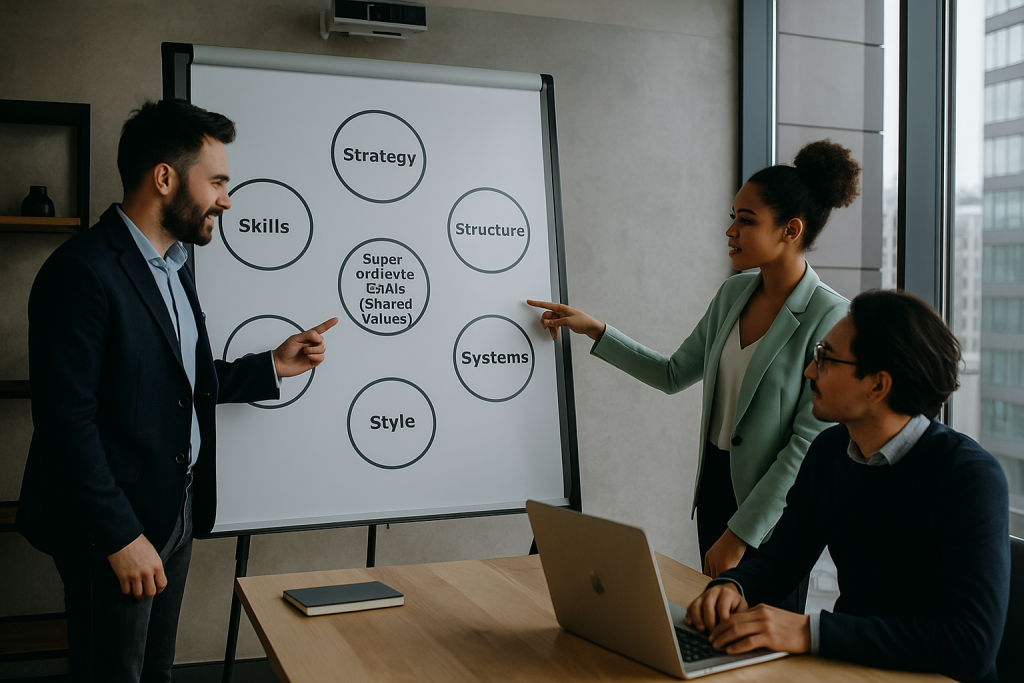 - McKinsey 7S-modell – a stratégia, struktúra, rendszerek, stílus, személyzet, készségek és közös értékek összehangolása.